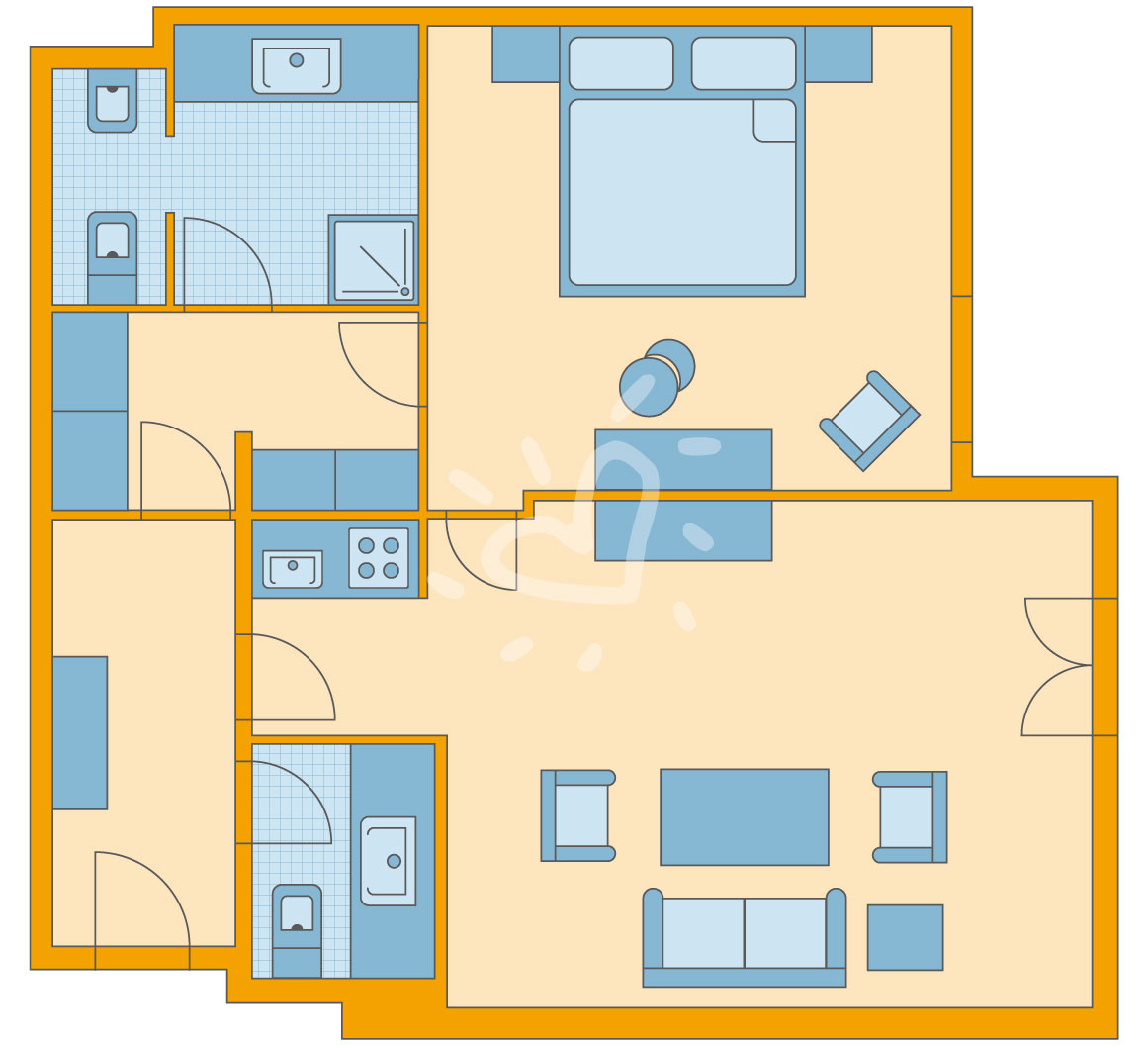 Ausstattung: Bad mit Dusche, WC, Föhn, TV, Telefon, Minikühlschrank, Safe, Terrasse und Klimaanlage/Heizung. Die hier abgebildeten Zimmerpläne stellen Wohnbeispiele dar.SafeWLANTVKlimaanlage -