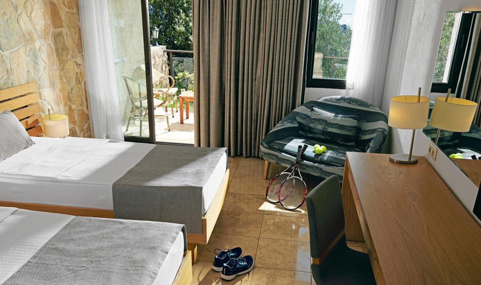 Die Zimmer sind in 2-stöckigen Bungalowgebäuden untergebracht und verfügen alle über ein offenes Bad mit Blick in das Zimmer, Toilette und Dusche sind jeweils mit einer Milchglastür zu schließen. Weiterhin sind die Zimmer mit Klimaanlage, Balkon oder Terrasse, Föhn, Bademantel, Slipper, Safe, Minibar (ohne Gebühr), Flatscreen, Telefon, Doppelbett und Wasserkocher ausgestattet.SafeWLANTVKlimaanlage