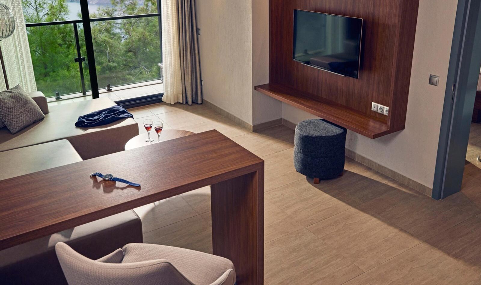Details anzeigenIn der Suite mit Meerblick steht Ihnen auf ca. 50 m² ein Wohn-/Schlafzimmer und ein separates Wohnzimmer zur Verfügung. Schon morgens genießen Sie mit einem Espresso in der Hand einen fantastischen Meerblick vom Balkon.