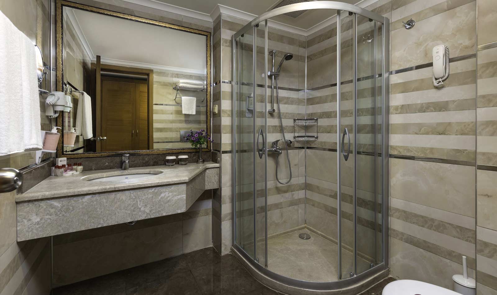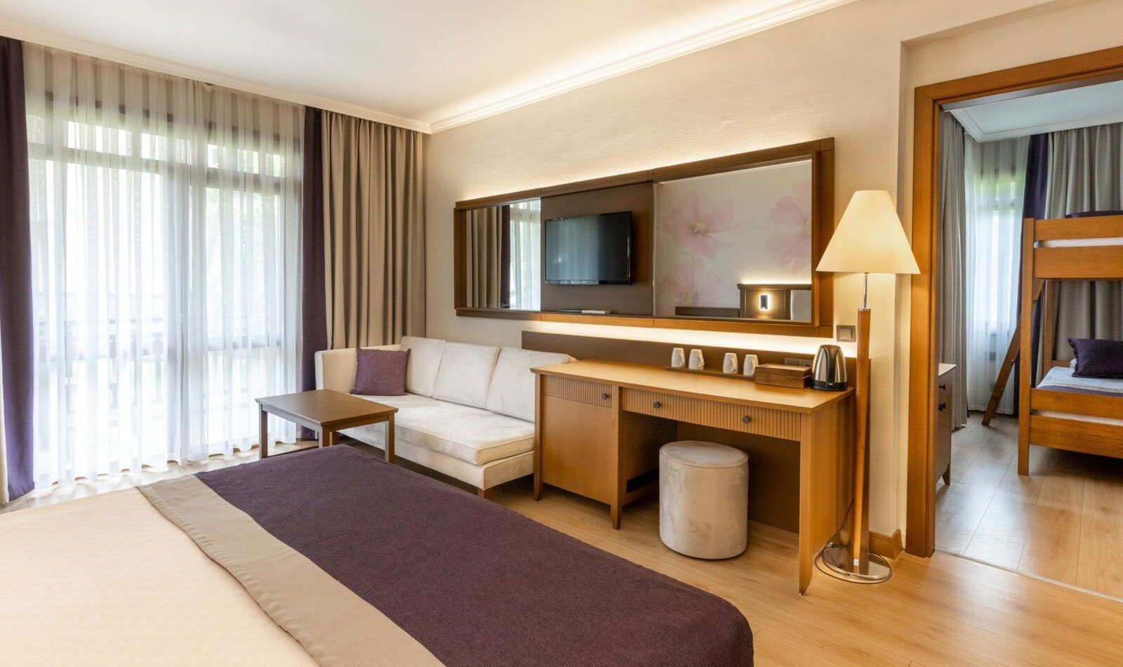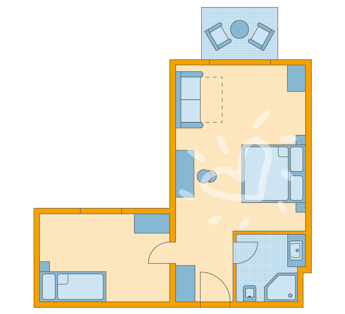 Klimaanlage: ohne Gebühr, individuell regelbar, kalt, warm, Fußboden: Fliesenboden, Laminat, Safe: ohne Gebühr, Wasserkocher, Minibar: gegen Gebühr, Softdrinks: gegen Gebühr, Wasser: ohne Gebühr, Telefon, Internet: WLAN/WiFi: ohne Gebühr, Fernseher: Flatscreen, im Wohnbereich, deutsches Programm, Sat-TV, Dusche, WC, Föhn, Kosmetikspiegel, Balkon: mit SitzgelegenheitSafeWLANTVKlimaanlage