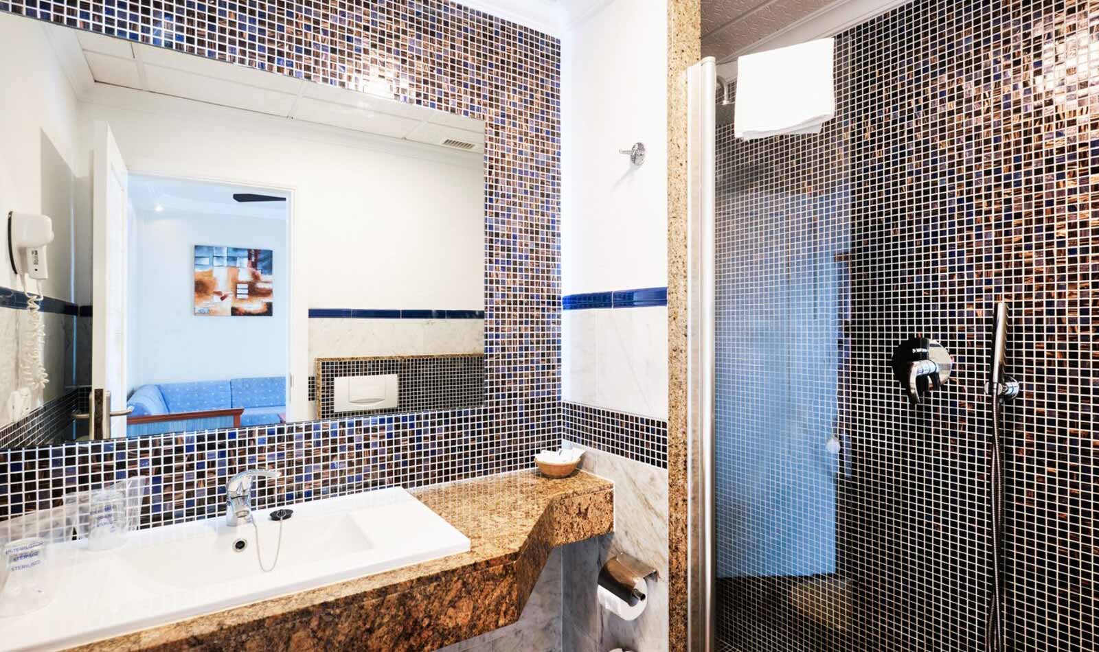 Fußboden: Fliesenboden, Laminat, Safe: gegen Gebühr, Deckenventilator, Sitzecke, Schreibtisch, Kühlschrank, Telefon, Fernseher: im Wohnbereich, deutsches Programm, Sat-TV, Dusche, WC, Balkon oder Terrasse: mit SitzgelegenheitSafeWLANTVKlimaanlageBalkon -